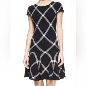 DEX Black White Knit Geometric Pattern Cap Sleeve Drop Waist Dress Shift