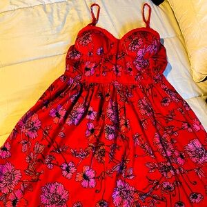 She + Sky Red Floral Smocked Bodice Dress