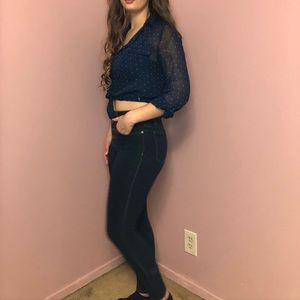Deep Blue Sheer Button Up With Teal and White Dots
