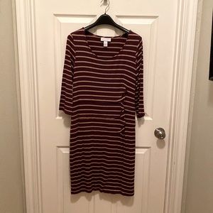 Maternity knee length burgundy and gold stripe dress.