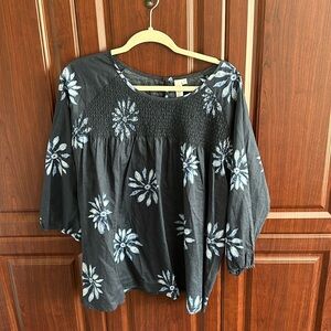 Blue & white batik style smocked blouse with 3/4 sleeves.