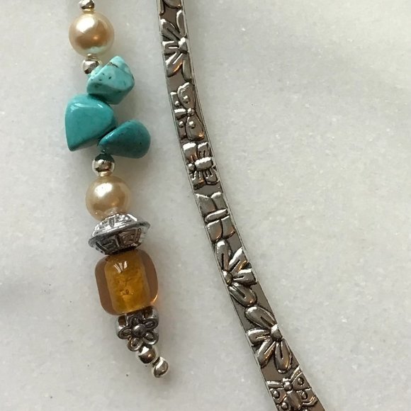 I love love this metal Tibetan flower engraved metal bookmark. The intricate engraving is so much more than I expected. The beautiful turquoise and amber beads both hold special memories for me. I am very pleased with my purchase.