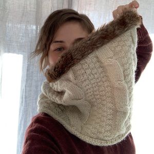 Cable knit acrylic cowl with faux fur trim.