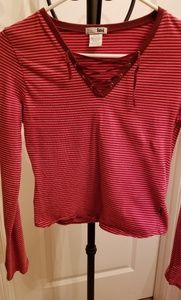 Gray, v-neck, long sleeve, cropped sweatshirt.