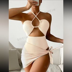 Cut-out Halter One Piece Swimsuit With Beach Skirt