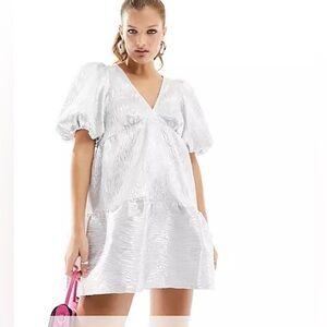 Nobody's Child Petite Vienna jacquard mini dress with puff sleeves in silver