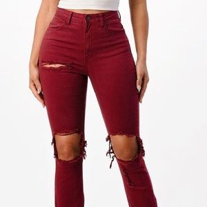 Ankle Tied Jeans available in Burgundy, high rise stretch fabric front destroyed