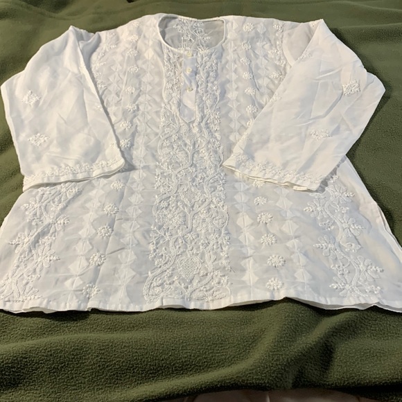 Tops - Beautiful, white, floral, sheer tunic.  Handmade in India.  Size small.