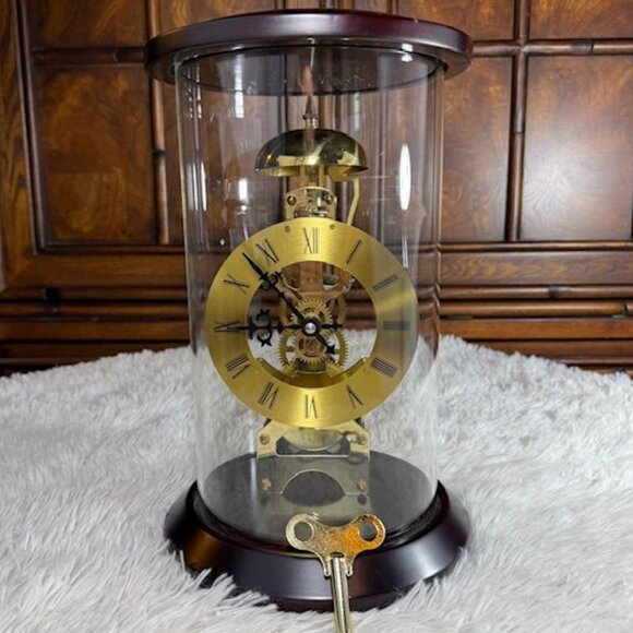 Beautiful skeleton clock very hard to find with the original glass. Was packaged exceptionally well made it through shipping with no issues will definitely buy from here again!!