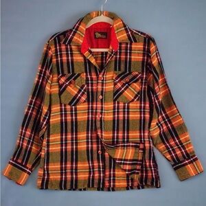 Vintage wool flannel in a vibrant plaid. Orange/red in excellent condition.