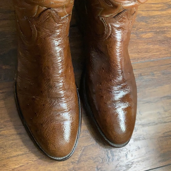Great boots! Very well cared for. (unsolicited advice) Justin's Exotic Boot cleaner or Scout brand are both good and wax-free. Waxes will expedite cracking since natural moistures in the air can't get to the leather (it'll dry out underneath the wax). If you're gonna stain the heels to spruce them up use steel wool or a boot brush and a mild cleaner (even dish soap) on them after they dry to get the excess stain off - then they'll be really good and dry and not sticky on the fingers.