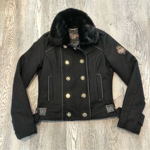 Coogi Womens Embroidered Wool Blend Varsity Jacket Fur Black Gold Small Vintage