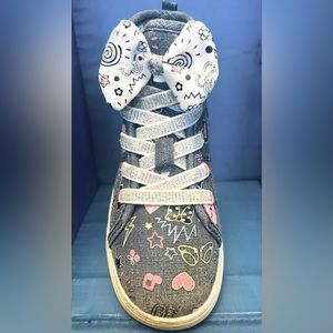 Easy on, Mary Jane toddler girl shoes. Denim/sparkles and a pretty bow on top.