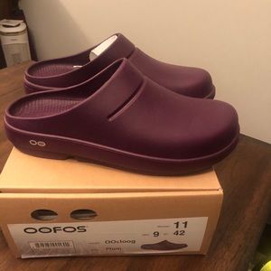 Plum colored Oofos clogs