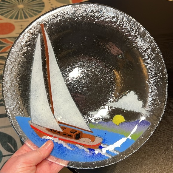 Artisan Other - Artisan Peggy Karr signed fused glass sail boat nautical scene bowl