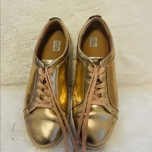 ADIDAS “ADITRACK” GOLD STRIPE SNEAKERS, SIZE 8
