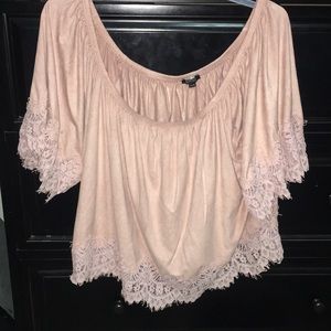 Off the shoulder somewhat cropped soft shirt.