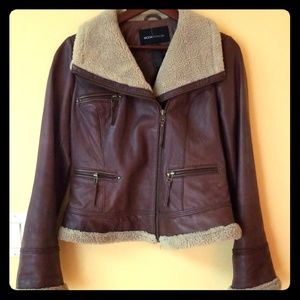 Vintage Leather Bomber Jacket Faux Shearling Trim