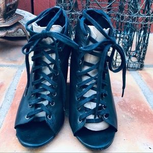 Joie Lace Up Open Toe Wedge Ankle Leather Booties Size 7 Black Heel 4”