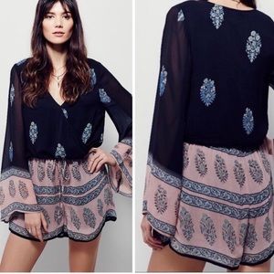 FREE PEOPLE Janpath Romper printed long sleeve XS navy printed
