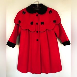 Red wool coat with velvet trim.