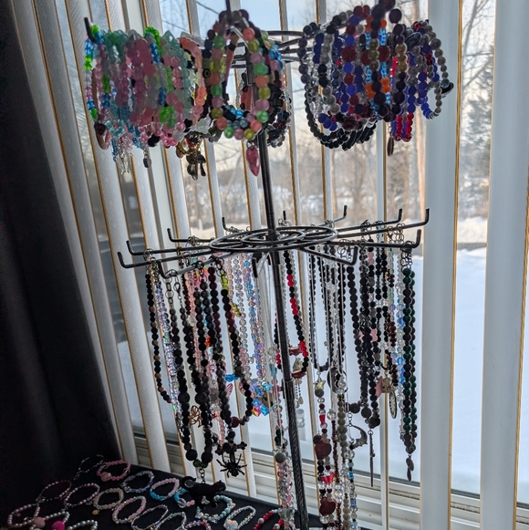 I started a small business in summer of 25 making bracelet, keychains and necklaces. fun, funky, sparkly,neon, glow in dark, fuzzy, unique, witchy, hippie , random jewelry and keychains/bag charms.