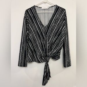 ASTR The Label V-Neck Black & White Striped Front Tie Long Sleeve - size M