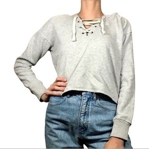 Aerie Women’s Heather Grey Raw Hem Lace Up Front Crop Top Hoodie Pullover