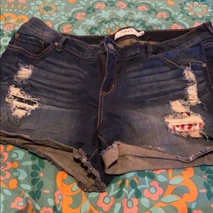 Ripped jean shorts, with American flag patches.