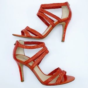 Alexandre Birman size 6.5 Coral Snakeskin & Braided Leather Stiletto Sandals
