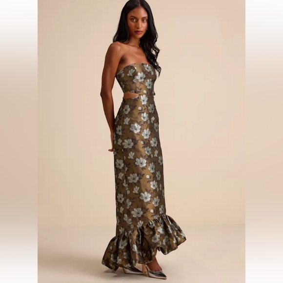 Reformation Dresses & Skirts - Reformation Square Neck Strapless Satin Gold Maxi Gown/Dress  Sz Medium