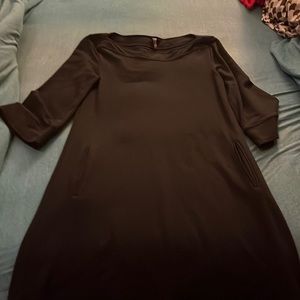 Navy blue, thigh length dress with white polka dots. Business casual.