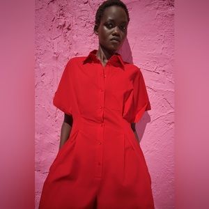 NWT ZARA SHORT POPLIN JUMPSUIT RED