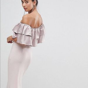 Silver Bloom Bardot Neck Maxi Dress. Ruffle Detail