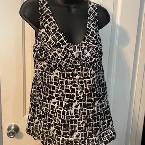 Coral, black and white geometric print sleeveless blouse w/ silver metal detail