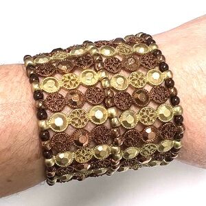 Copper & Gold Tone Stretch Cuff Bracelet Filigree Flowers Small Beads Medallions
