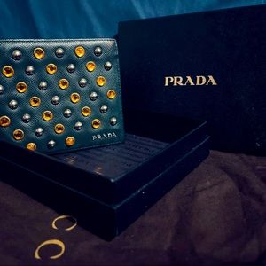 Mens [Green] Prada wallet w/ clear & orange rhinestones. Very good condition.