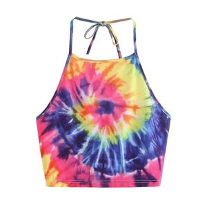 Sexy Backless Tie Halter Crop Top Spiral Tie Dye Multicolor Rainbow Womens Small