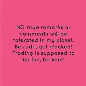 I ONLY TRADE WITH USERS BASED OFF OF THE ACCOUNTS POSH REVIEWS! Dont tell me you have all these great trade reviews on a past user, etc. Such claims are EASILY faked by many. IF YOU ARE TAGGED HERE: its because you asked me to trade and i didnt see any feedback OR THERE IS VERY LITTLE! These are rules in my closet for such situations, i will gladly trade if youve agreed to ship first and i will guide you through the whole process! If you dont like my rules, dont be rude about it!
