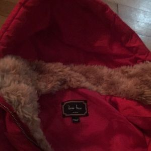 Red fur lined collar with hood. Zip closure. Cute boutique find. Only worn once perfect condition! Fits S/M.
