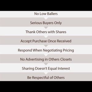 Please be respectful!! Please accept your purchase once you have received it! If you receive your package from me and do not accept it or if you send insulting low ball offers, I will block you from shopping my closet again.