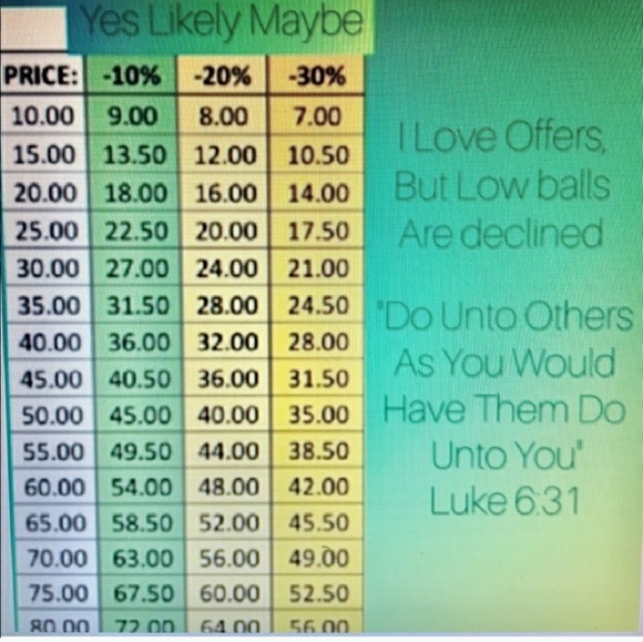 @wongohana007 Hi, this is the chart that I go by for how much I can discount. And your dollar amount was about 45% off, and that's just to lowball for me to accept. Thanks and have a great day!