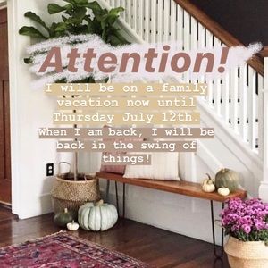 I am going to be away for a family vacation until Thursday, July 12th. When I am back, I will be back into business! :))