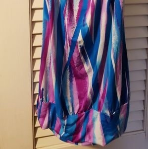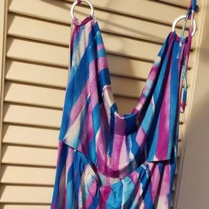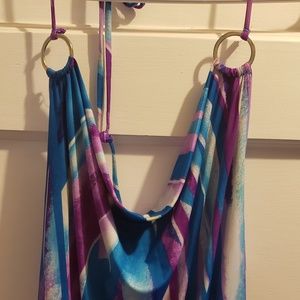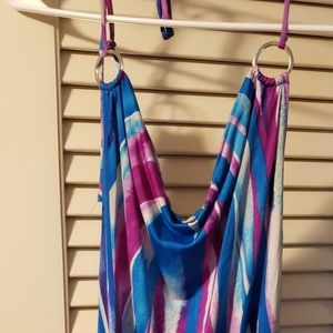 Very soft and silky flowy fit halter top with 2 rings on either side that tie around the back of your neck. Worn a few times, great condition size M. Smoke free/pet free home ( the black line across the middle is just from joining 2 photos together to show the entire top, there is nothing wrong with the fabric, it's in perfect condition)