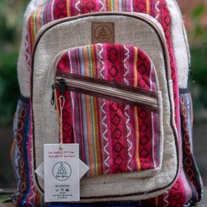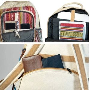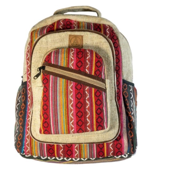 About: made from eco-friendly natural hand-woven hemp fabric, durable polyester fabric lining, double stitched, adjustable shoulder straps and metal YKK zippers with elasticized, external pockets on both sides.
