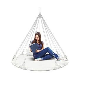 About: 100% cotton fabric. Sturdy circular steel frame • Supports up to 264 pounds • Package Includes: hanging swing, support pillow, hardware screws, and instructions • Hand wash. Entire Unit Measures approximately 56" D x 46.25“H; (Approx.75” thick).