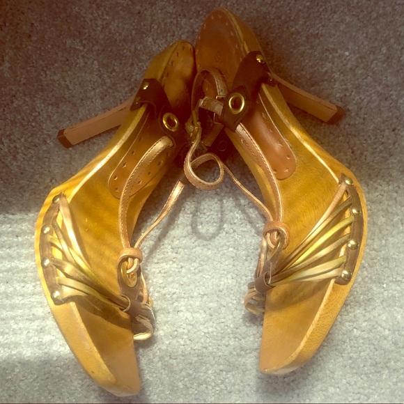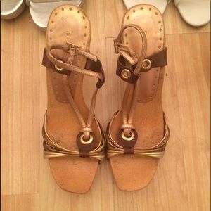 Rose gold, bronze, and brown low heel sandal
