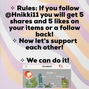 βIF YOU FOLLOW @Hnikki11 here on Poshmark you will RECIEVE a FOLLOW BACK! OR 5 SHARES AND LIKES ON YOUR ITEMS!