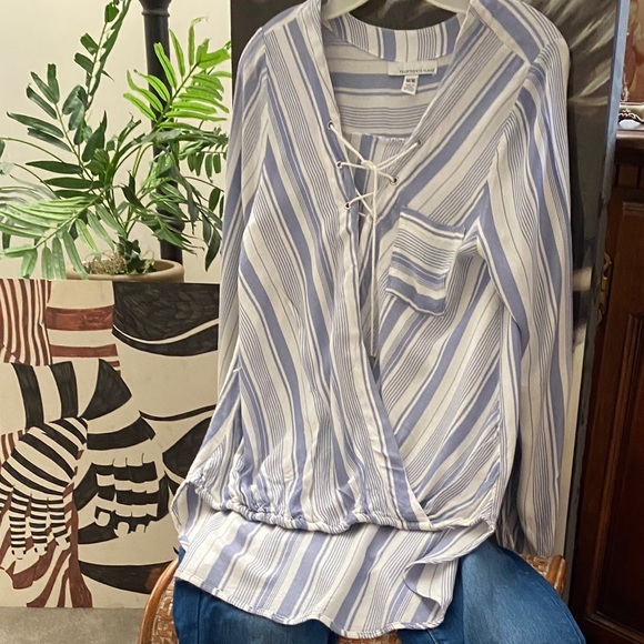 Ladies blue and white stripe blouse with tie up front for accent. Long sleeves and hangs longer in the back than the front.