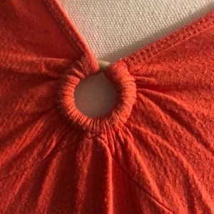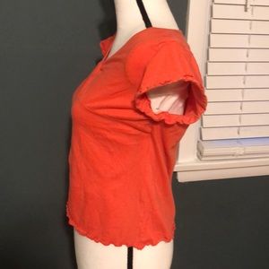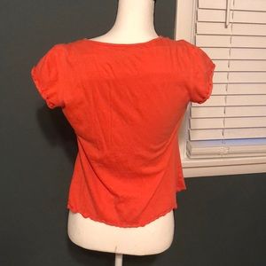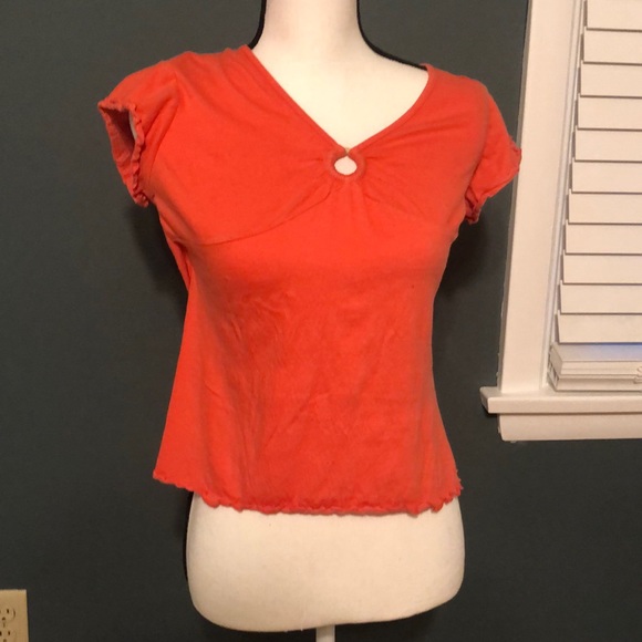 This stylish shirt has a decorative wooden circle at the chest, the bottom and sleeves are wavy